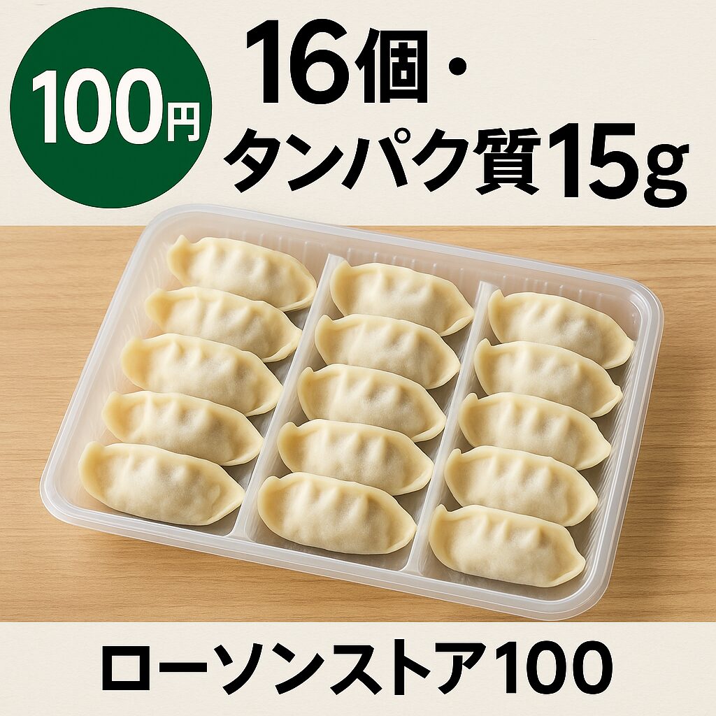 餃子というと「脂質多めで太りやすい」というイメージがあるかもしれませんが、ローソンストア100の肉餃子は1パックでタンパク質14〜16gほど。