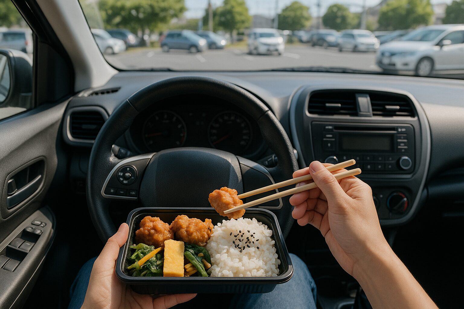 車の中でお弁当。誰にも邪魔されず、好きなタイミングで一口食べられる幸せ。