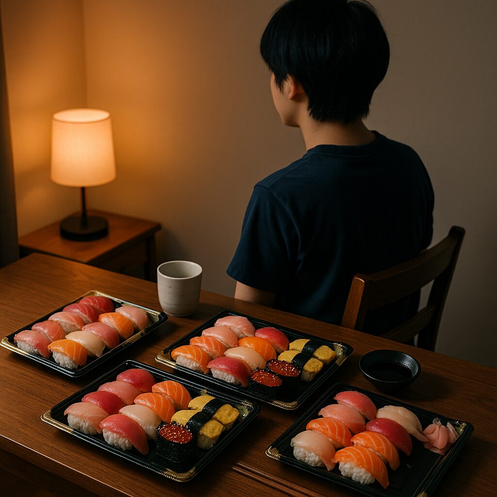 寿司5人前をひとりで食べても、誰も見ていない。