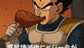 たとえば初登場シーン。惑星を滅ぼし、宇宙船に戻ったベジータは、ナッパとともに肉を噛みちぎるように食べる。これは共同食事というより、戦士がただ体力を補給するための行為。そこに温度のある「食卓」の雰囲気はほとんどない。食べるという行為に情緒的な意味を持たせず、**「戦闘の燃料」**として淡々と処理している印象だ。